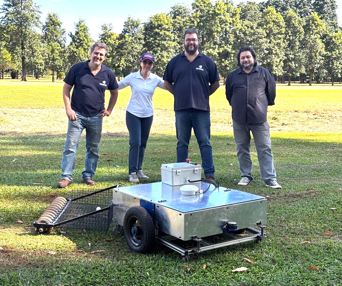 “Então esse foi o intuito e daí nasceu o GreenBot. Um captador de bolas, um aplicador de defensivos agrícolas ou de fertilizantes ou uma roçadeira, dependendo da programação e função. Hoje ele está pronto. Então é uma grande satisfação poder atender essa demanda. O GreenBot sana todas essas dificuldades e pode atender perfeitamente aquilo que foi solicitado. Ele chega até a 40 horas de trabalho ininterrupto.