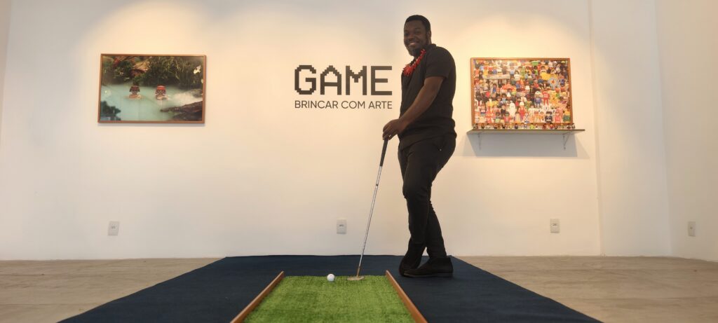 A exposição de Heberth Sobral foi pensada de modo que os visitantes possam interagir com as obras. O “Papá Golfe”, de 300 x 70 cm, uma estrutura que simula um pequeno campo de golfe, onde o público pode testar suas habilidades com o taco. “O golfe é um esporte inacessível para a maioria dos brasileiros, por isso estará no centro da galeria, para todos jogarem. É o lúdico em várias camadas. A arte brincando com o jogo, com a criança, com as estruturas sociais”, explica o artista, de 41 anos.