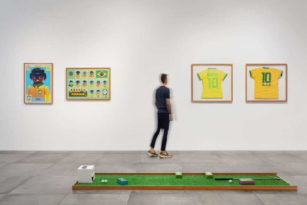 Outra obra com a simbologia do Playmobil é a série de fotografias que recria, em formato de álbum de figurinhas, a seleção brasileira da Copa do Mundo de 1970 — Pelé, Rivellino, Gérson, Jairzinho… — por meio de montagens, impressas sobre papel, na dimensão de 100 x 70 cm. Outro destaque é “Dominó azul” da série “Sala de Jogos’, composto por 28 tijolos, pintados de azul, dispostos em forma de jogo na parede.