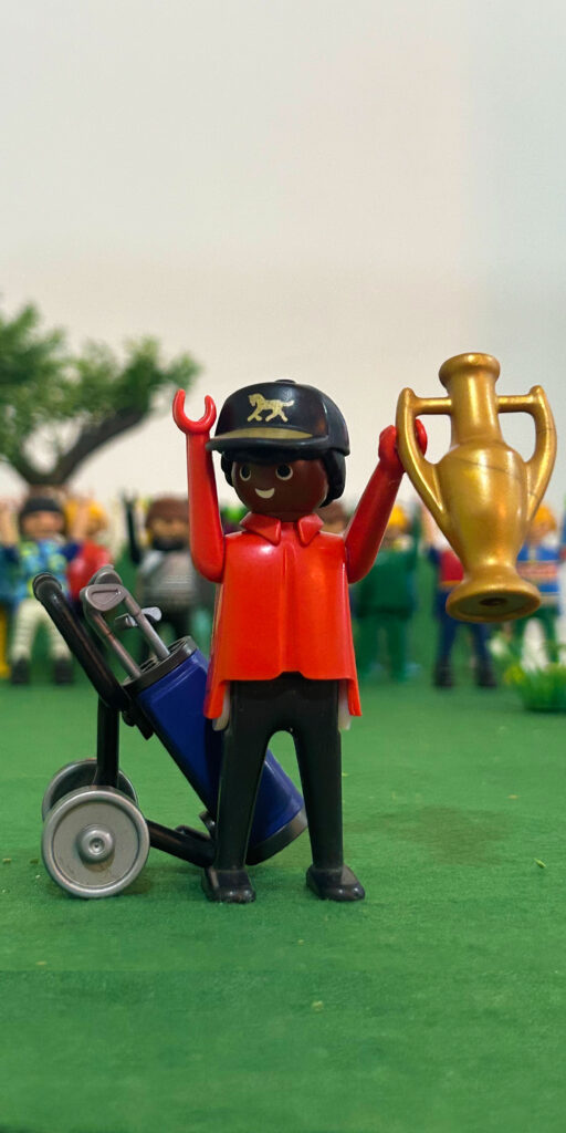 O destaque é “Papá Golfe”, obra interativa que simula um pequeno campo de golfe, onde o público pode testar seu talento. Há também fotos de Tiger Woods na versão Playmobil, além de outros ídolos do esporte como Senna, Pelé, Rivellino, Gérson, Jairzinho.