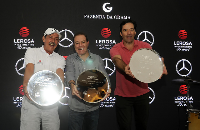 Premiação – Pedro Martins, capitão do Fazenda da Grama, e Luiz Gonzaga Dias Filho, o Tom Zé, futuro capitão, comandaram a entrega de prêmios que foi feita por João Lerosa, presidente da Lerosa Investimentos, o mais novo patrocinador do golfe brasileiro; Luis Henrique Araujo, presidente do Fazenda da Grama; Dirlei Dias, Nivaldo Mattos e Tiago Favilla, da Mercedes-Benz, e Silvia Nishi, a capitã do clube. Pedro fez um agradecimento especial ao head-pro Kevin Bulman e ao gerente Sylvio Telles Siqueira que foram decisivos pela qualidade do campo e para o sucesso do evento.